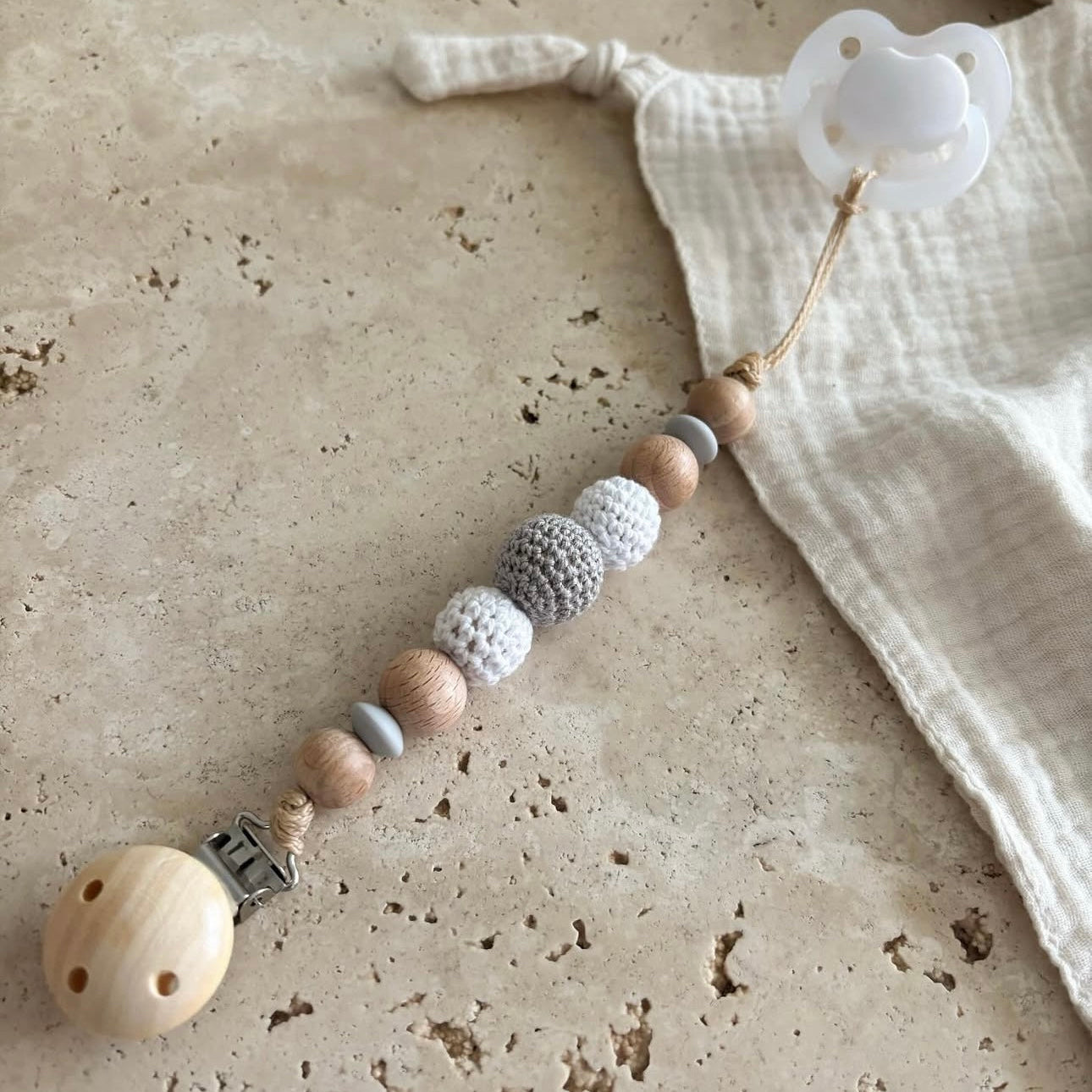 Toutes nos créations sont composées de perles en bois de hêtre non traité et silicone naturel.
