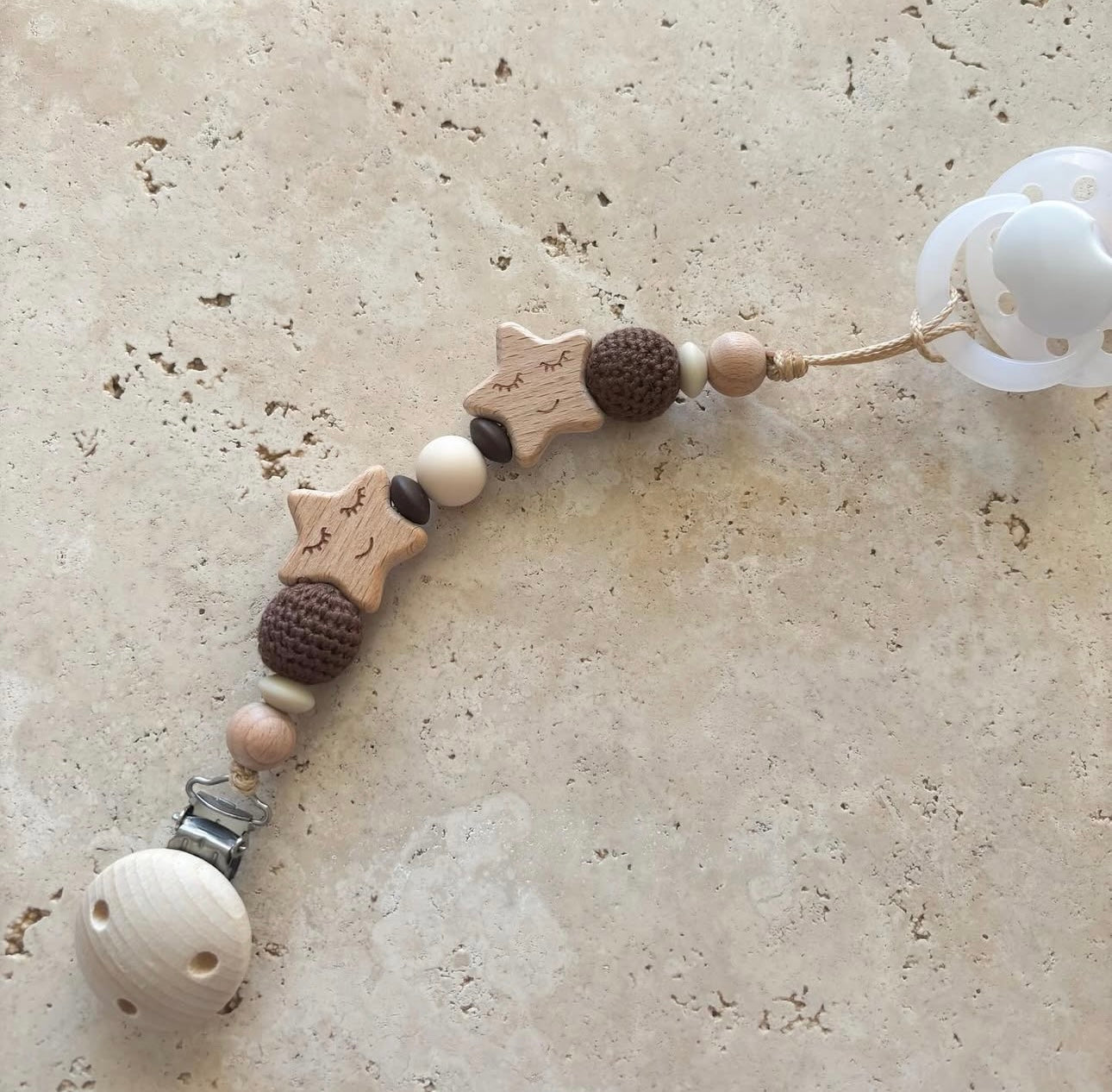 Toutes nos créations sont composées de perles en bois de hêtre non traité et silicone naturel.
